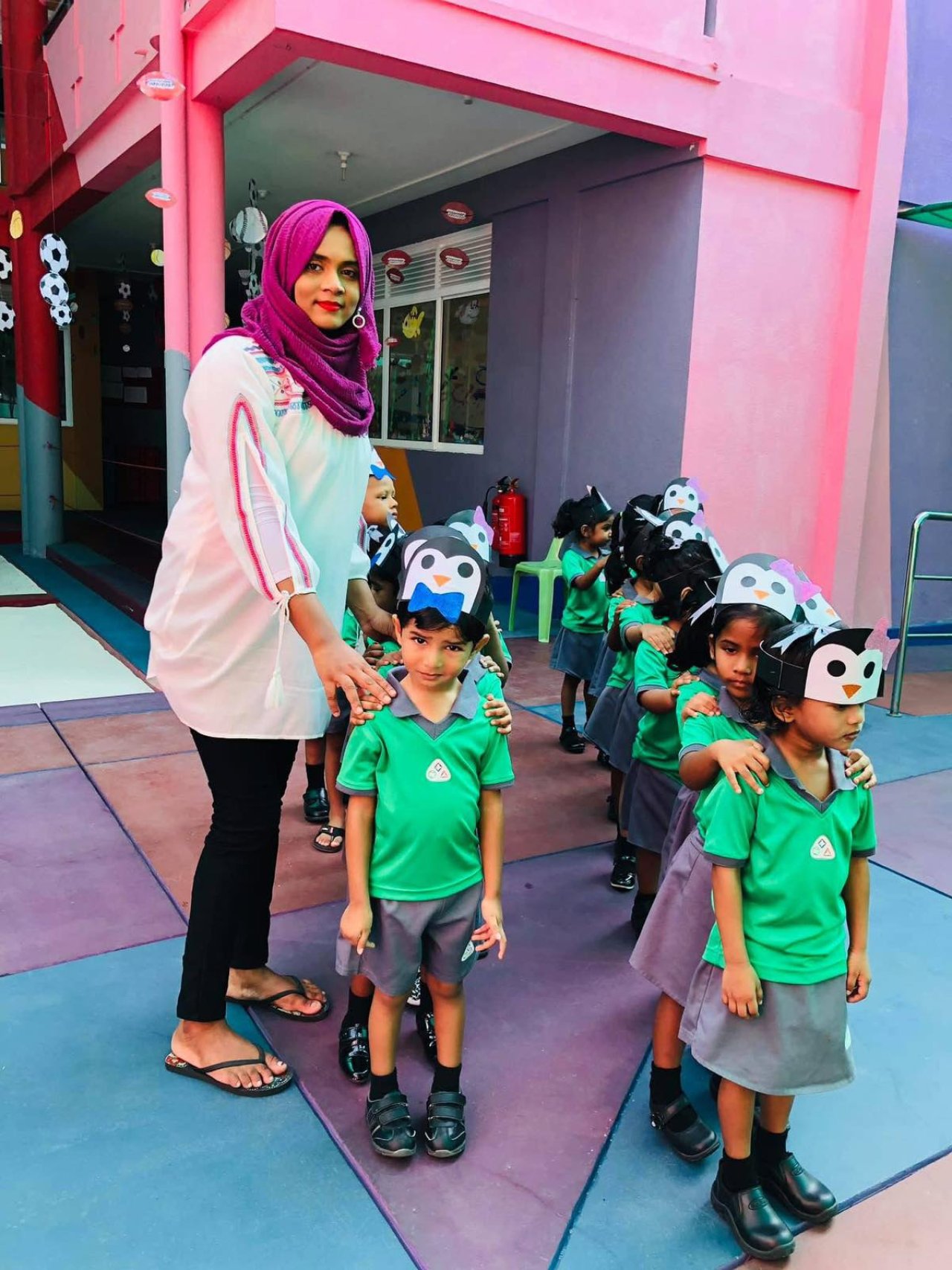 ފަހުން ޓީޗިން ދާއިރާއަށް ރަސްމީކޮށް ވަނުމަށް އޭނާ ޕްރީސްކޫލް ޓީޗިން ޑިގްރީ ހެދި އެވެ. އެއަށްފަހު މާލޭގެ ބައެއް ސްކޫލުތަކުގައި ވެސް އޭނާ މަސައްކަތް ކޮށްފައިވެ އެވެ. އޭގެ ތެރޭގައި ހިރިޔާ ސްކޫލް، އަހުމަދިއްޔާ އިންޓަނޭޝަނަލް ސްކޫލް، ލިޓްލް ޖެމްސް ޕްރީ ސްކޫލް އަދި ދޮންދޫނި ޕްރީ ސްކޫލް ހިމެނެ އެވެ.