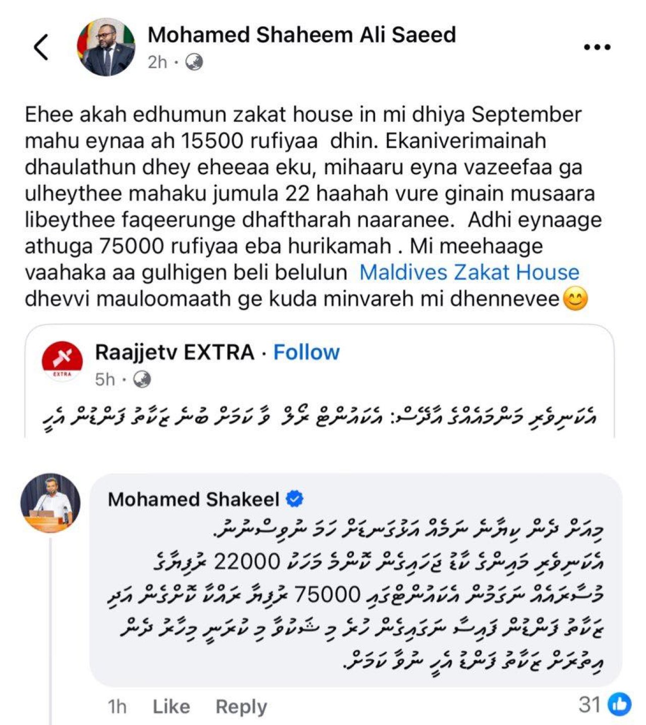 އެގޮތުން، އެ އަންހެންމީހާ އެހީއަކަށް އެދުމުން ޒަކާތު ހައުސްއިން މިދިޔަ ސެޕްޓެމްބަރު މަހު އޭނާއަށް 15،500 ރުފިޔާ ދިން ކަމަށާއި އެކަނިވެރި މައިންނަށް ދައުލަތުން ދޭ އެހީވެސް އެމީހާއަށް ލިބޭ ކަމަށް ޝަހީމް ވިދާޅުވިއެވެ. ޝަހީމް ވަނީ އޭނާއަކީ ވަޒީފާ އަދާކުރާ މީހެއްކަން ފާހަގަކުރައްވާފައެވެ. އަދި އެ އެލަވަންސްއާއެކު މަހެއްގެ މައްޗަށް 22،000އަށް ވުރެ ގިނަ ރުފިޔާގެ އާމްދަނީއެއް ލިބޭތީ އެމީހާ ފަގީރުންގެ ދަފުތަރަށް ނާރާ ކަމަށް ޝަހީމް ވަނީ ވިދާޅުވެފަ އެވެ.