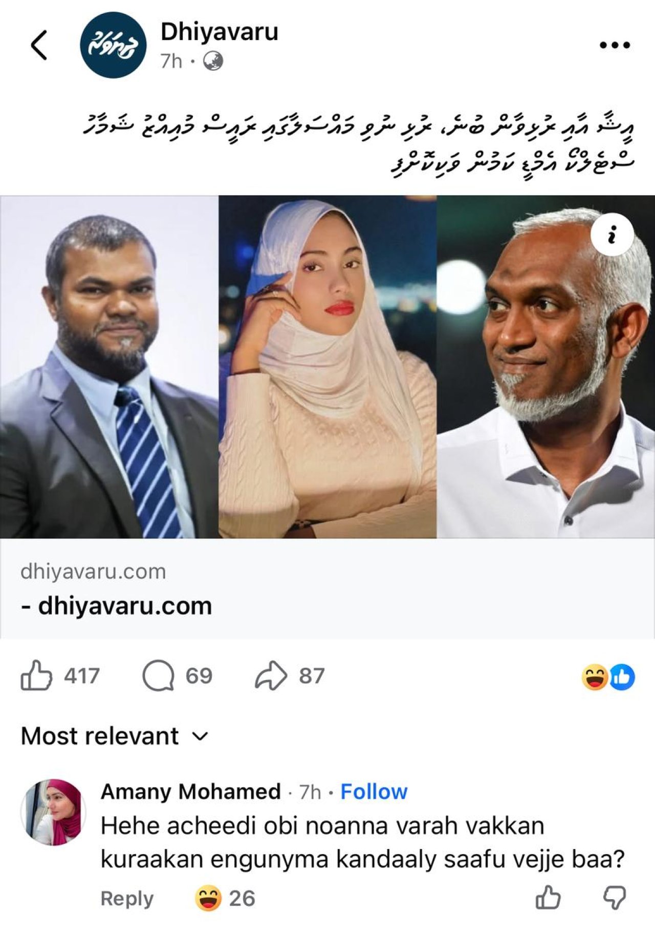 އަމާނީ ކޮމެންޓްކުރެއްވި ހަބަރުގައި ރައީސް މުއިއްޒު، ސަމާހު އަދި ސަމާހު މިހާރު ލޯބީގެ ގޮތުން ގުޅިގެން އުޅޭ މީހާގެ ފޮޓޯއެއް ޖަހާފައި ވެ އެވެ.
