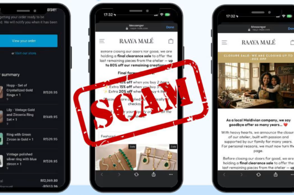 ފުލުހުންގެ އެންޓި ސްކޭމް ސެންޓަރުން ބުނީ ޖުވެލަރީ ފިހާރައަކަށް ހެދިގެން އެ ޕޭޖުން ސްކޭމްގެ މަޅީގައި މީހުން ޖައްސަނީ 80 ޕަސަންޓާ ހަމައަށް ޑިސްކައުންޓް ދޭ ކަމަށް ކަސްޓަމަރަށް ދައްކައިގެން ކަމަށެވެ.