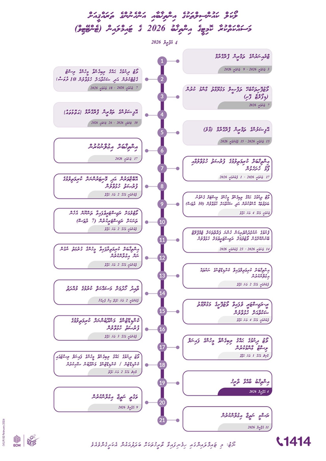 ލޯކަލް ކައުންސިލްތަކުގެ އިންތިހާބާއި އަންހެނުންގެ ތަރައްގީއަށް މަސައްކަތްކުރާ ކޮމިޓީގެ އިންތިހާބު 2026 ގެ ވޯޓު ނެގުމަށް ހަމަޖެހިފައިވަނީ، 2026 އެޕްރީލް 4 ވާ ހޮނިހިރު ދުވަހުގެ ހެނދުނު 8:00 އިން ހަވީރު 4:00 އަށެވެ. އަދި ރަސްމީ ނަތީޖާ އިއުލާނުކުރުމަށް ހަމަޖެހިފައިވަނީ 2026 އެޕްރީލް 11 ވާ ހޮނިހިރު ދުވަހު އެވެ.