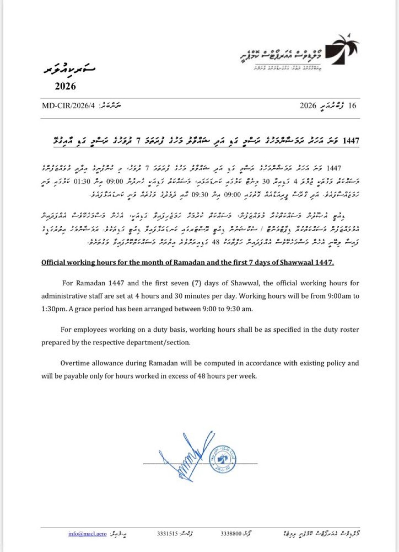 ވެލާނާ އިންޓަނޭޝަނަލް އެއާޕޯޓު (ވީއައިއޭ) ހިންގާ އެމްއޭސީއެލް އިން ނެރުނު ސާކިއުލާ އެއްގައި ބުނެފައި ވަނީ، 1447 ވަނަ އަހަރުގެ ރަމަޟާން މަހާއި ޝައްވާލު މަހުގެ ފުރަތަމަ ހަތް ދުވަހު އެ ކުންފުނީގެ އިދާރީ މުވައްޒަފުންގެ މަސައްކަތު ގަޑިއަކީ ހެނދުނު 9:00 އިން މެންދުރުފަހު 1:30 އަށް ކަމަށެވެ.