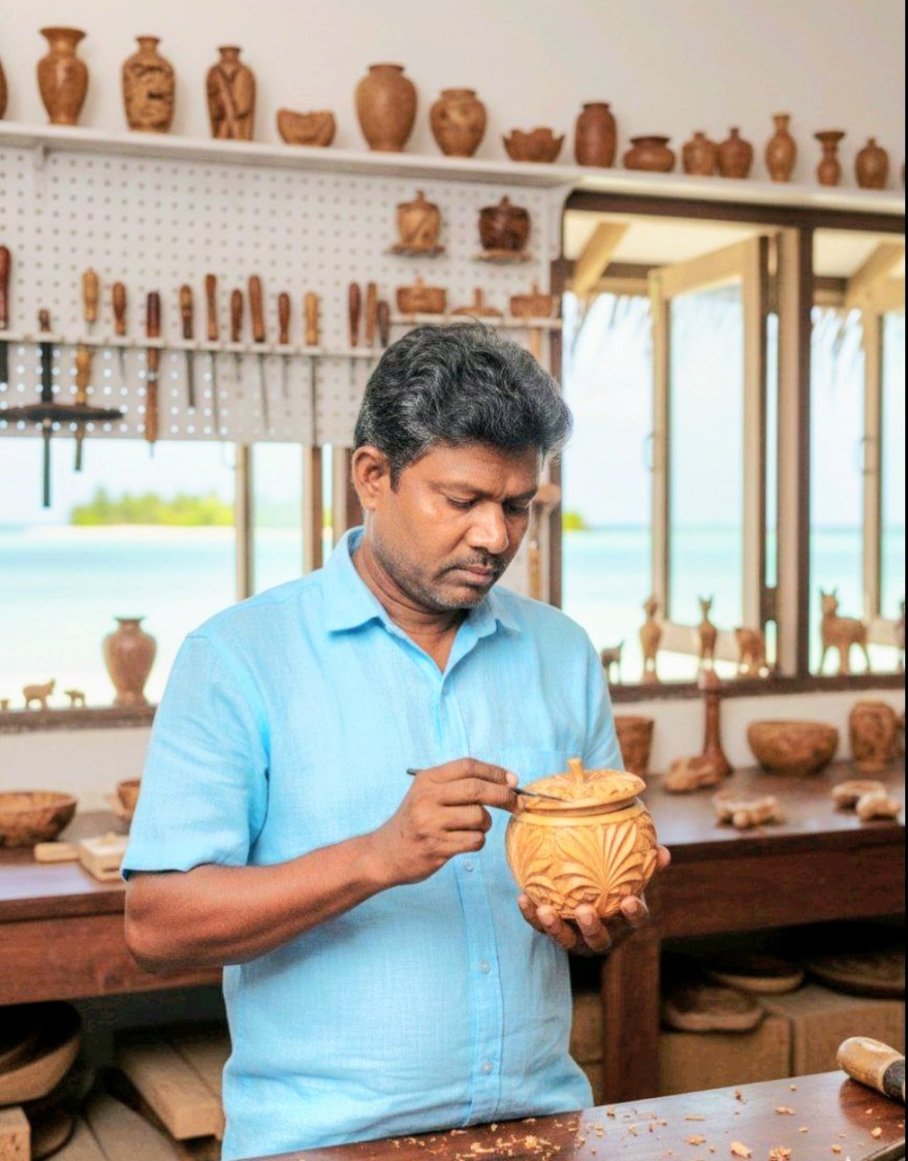 ޖޭ ޑަބްލިއު މެރިއޮޓް ރިސޯޓުގައި 4 ވަރަކަށް އަހަރު ވެފައިވާ ނަސީމު މިހާރު ކުރާ މައިގަނޑު މަސައްކަތަކީ ލަކުޑިންނާއި އިލޮށި އަދި ފަން ބޭނުންކޮށްގެން ތަފާތު އެއްޗެހި ހެދުމެވެ. އެންމެ 30 މިނެޓުގެ މަސައްކަތުން އެހަދާ އެއްޗެއް މުޅިން ނިންމާ ހަވާލުކޮށްލުމުގެ ގާބިލްކަން އޭނާގެ ކިބައިގައި މިއަދު ވެ އެވެ. އާންމުކޮށް އޭނާ ލިޔާ ތަކެއްޗަކީ ޓުކުރި، ގުޅި، މަލާފަތް، މަތިޖެހި އާފަލު، އަނގޮއްޓި ލާ ދަޅެވެ. އެ ރިސޯޓުގެ ކޮޓަރިތަކުގަ އާއި ކައުންޓަރުތަކުގައި އޭނާ އިލޮއްޓާއި ފަނުން ހަދައިދީފައި ހުންނަ ޓްރޭ، ވަށި، ދޫނި ފަދަ އެއްޗިހި ބަހައްޓާފައި ހުރެ އެވެ. ބީޗް ކުޑަތަކުގެ ގޮބު ހަލާކު ވެއްޖެނަމަ ވަގުތުން ލިއެ އާކޮށްލުމަކީ ނަސީމްއަށް ދާދި ފަސޭހަ ކަމެކެވެ.