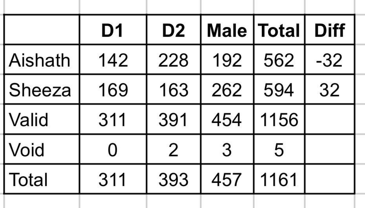 މާލޭގައި ބެހެއްޓި ވޯޓު ފޮށިން އައިޝަތު އަބްދުލް ގާދިރަށް 192 ވޯޓު ލިބުނުއިރު، ޝީޒާއަށް 262 ވޯޓު ލިބިފައިވެ އެވެ.