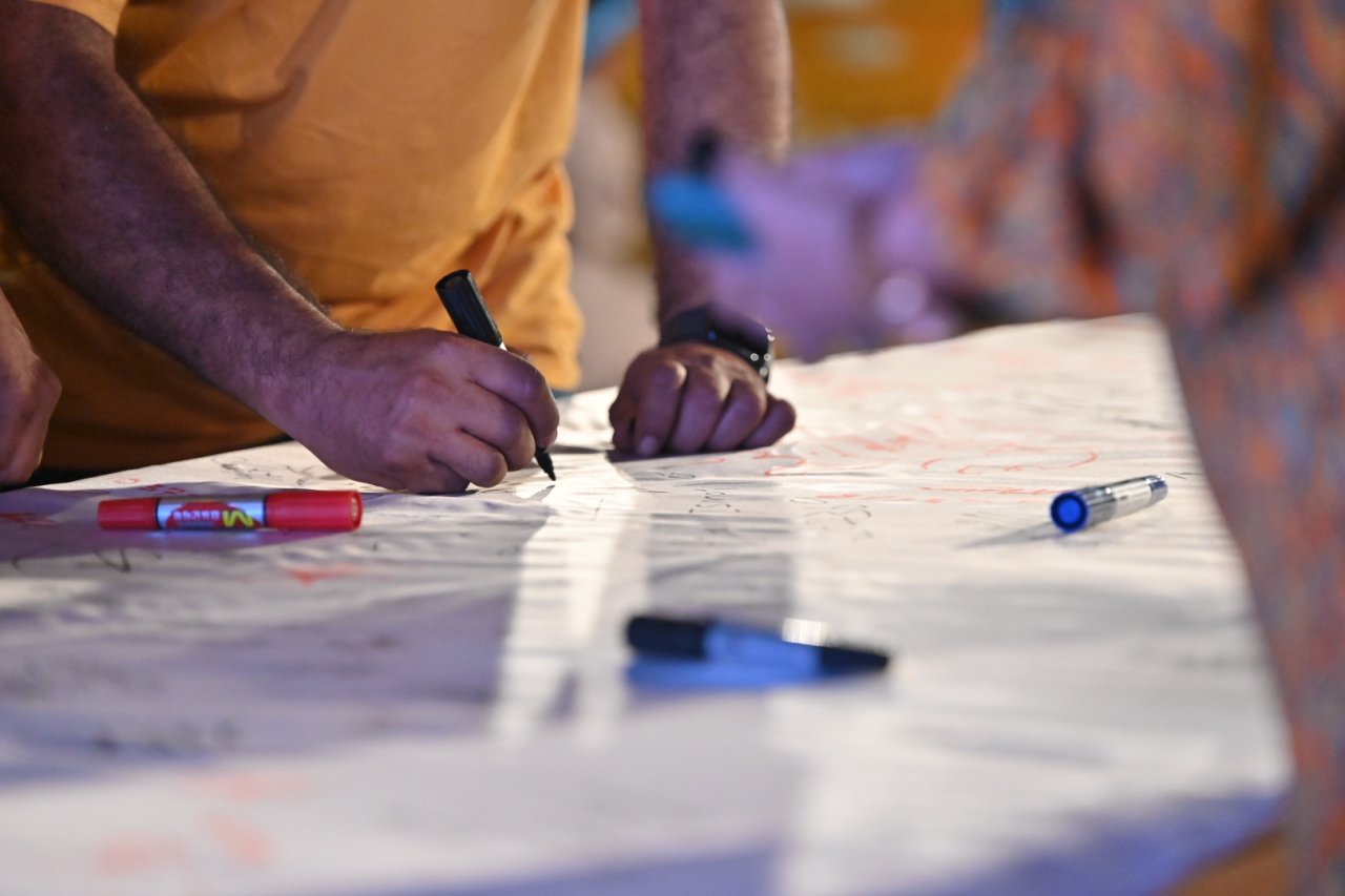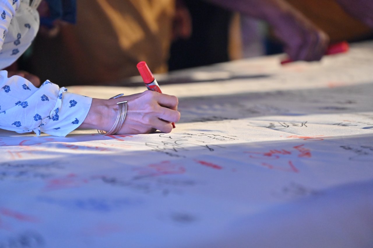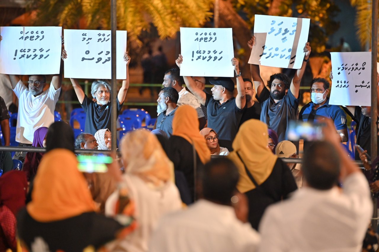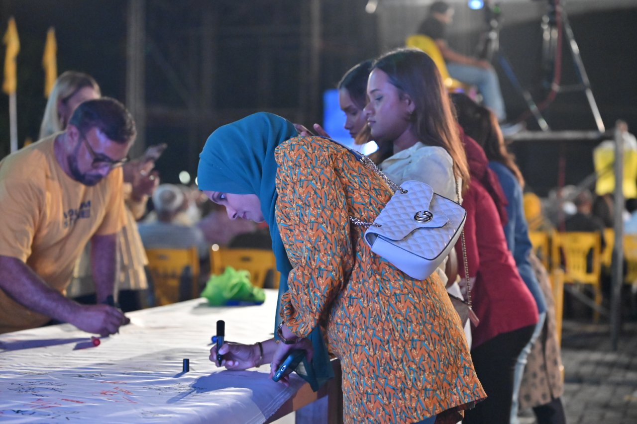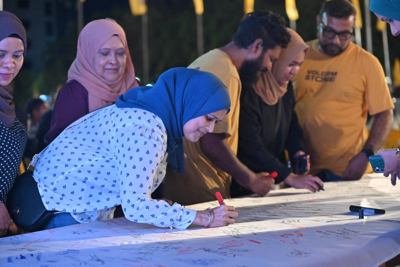 އެމްޑީޕީން ރޭ ކާނިވާ ސަރަހައްދުގައި ބޭއްވި ޖަލްސާއަށް ދިޔަ މީހުން އެތަނުގައި އޮތް ޕެޓިޝަންގައި ސޮއިކުރަނީ. ފޮޓޯ: އެމްޑީޕީ