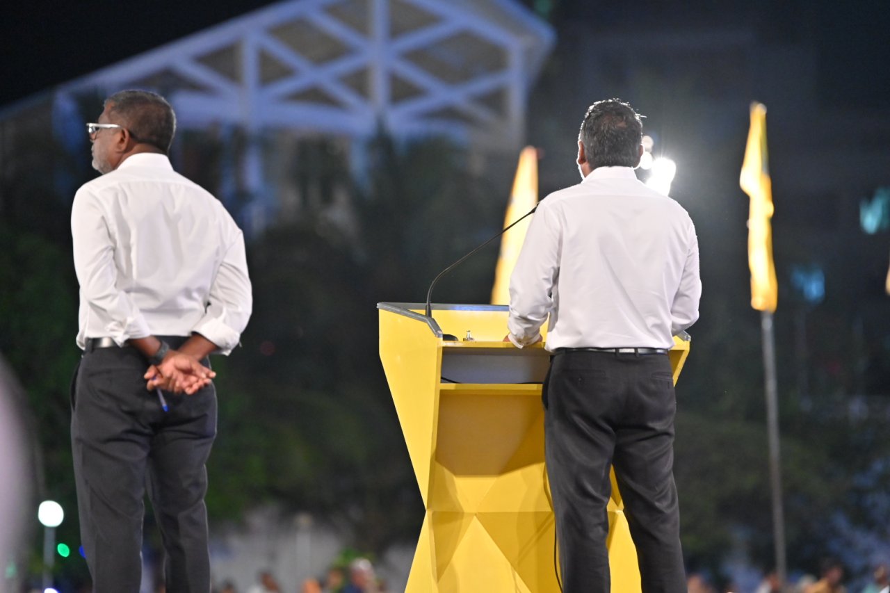 އެމްޑީޕީން ރޭ ކާނިވާ ސަރަހައްދުގައި ބޭއްވި ޖަލްސާގައި އެމްޑީޕީގެ އެޑްވައިޒަރު އަދި ރައީސް އިބްރާހިމް މުހައްމަދު ސޯލިހު ބަޔަކާ ސަލާމްކުރައްވަނީ. ފޮޓޯ: އެމްޑީޕީ